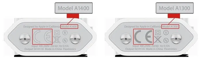 Pour savoir si votre chargeur est concerné, rien de plus simple, regardez les inscriptions notées entre les deux broches de votre chargeurs. Vous devez vérifiez deux choses, le numéro de modèle et le logo CE.