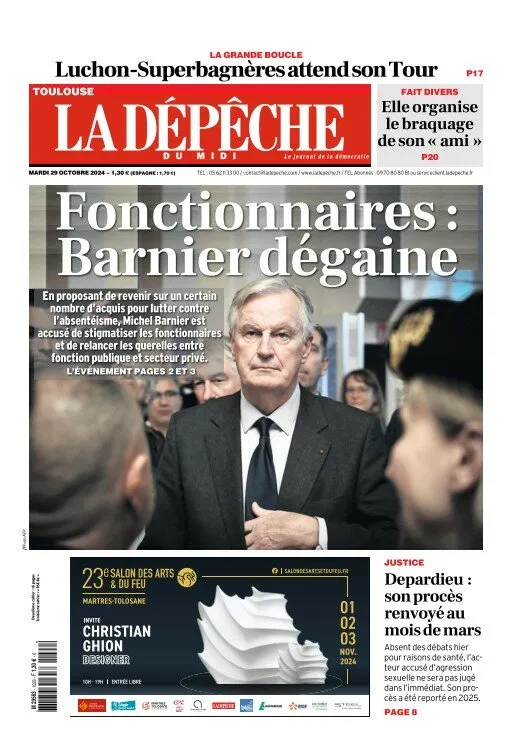 La Dépêche du Midi s'interroge : le gouvernement de Michel Barnier est-il en train de stigmatiser les fonctionnaires dans quête d'économies ? Plusieurs mesures sont envisagées, dont la dernière en date : l'alignement du public sur le privé en instaurant trois jours de carence au lieu d'un seul pour réduire l'absentéisme des agents. Le quotidien revient sur le report du procès de Gérard Depardieu à l'année prochaine pour raisons de santé et sur l'arrivé d'un étape du Tour de France 2025 à Luchon-Superbagnères, le tracé ayant été révélé hier.