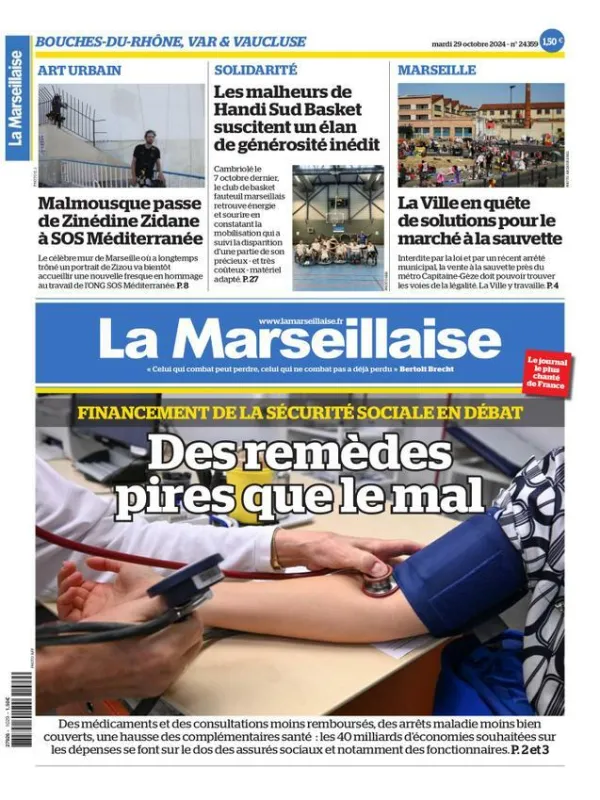 La Marseillaise s'inquiète pour nos concitoyens. La réforme de la Sécurité sociale qui risque d'impacter les fonctionnaires, va peut-être pénaliser l'ensemble de la société : médicaments moins remboursés, arrêts maladie moins indemnisés, hausse du prix des mutuelles. La facture santé des Français va s'alourdir. Info surprenante et qui va sans doute déchaîner les passions : l'immense fresque à l'effigie de Zinedine Zidane symbole de la ville va être remplacée par une fresque rendant hommage à l'ONG SOS Méditerranée qui vient en aide aux migrants.