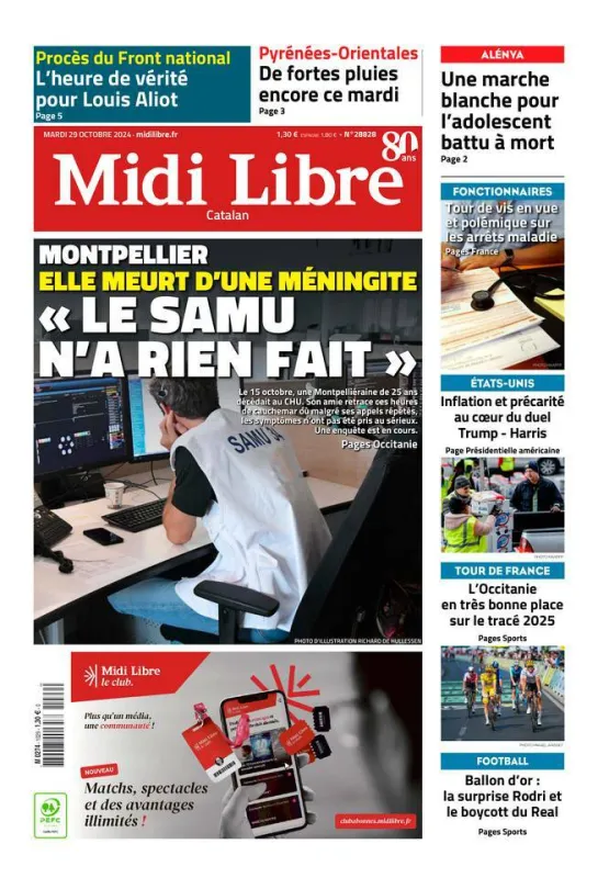 Le 15 octobre, le Samu de Montpellier n'aurait pas pris au sérieux l'appel à l'aide d'une jeune femme de 25 ans. Elle décèdera d'une méningite. Est-ce là le symbole de la déchéance et du manque de moyens de nos services de soins auxquels le gouvernement veut s'attaquer pour réduire le déficit ? Le quotidien revient lui aussi sur la réforme des arrêts maladie des fonctionnaires, le tracé du Tour de France 2025 qui va passer par l'Occitanie, l'inflation et la précarité et la précarité aux Etats-Unis qui seront au coeur du duel Trump-Harris et, symbole de l'insécurité dans notre pays, la marche blanche organisée en l'honneur d'Emilio, adolescent battu à mort à Alénya.