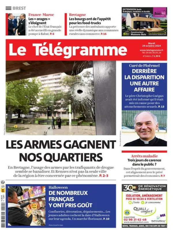 Après le drame de Pacé, où un enfant de 5 ans a reçu deux balles dans la tête samedi, Le Télégramme de Brest constate que Rennes et sa banlieue ne sont pas les seules a être débordées par la circulation des armes à feu. Retour sur la mesure qui risque de déclencher une levée de boucliers dans les jours à venir, soit le passage à trois jours de carence pour les arrêts maladie des fonctionnaires et, actualité plus légère, sur l'engouement des Français pour Halloween.