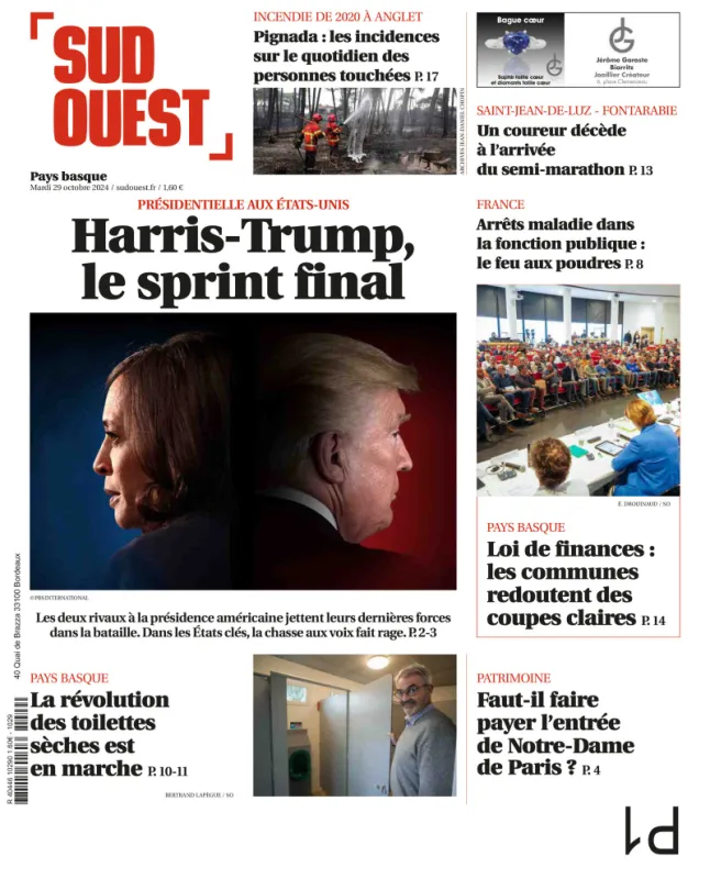 Sud Ouest édition Pays-Basque consacre sa une au duel Donald Trump-Kamala Harris qui est dans son "sprint final". L'heure est à la chasse aux dernières voix qui pourraient être décisives le 5 novembre, date du dépouillement des bulletins. Le quotidien revient également sur la mesure qui vise les arrêts maladie des fonctionnaires, sur celle qui risque de raboter les budgets des collectivités et se pose la question faut-il faire payer l'entrée de Notre-Dame de Paris ?