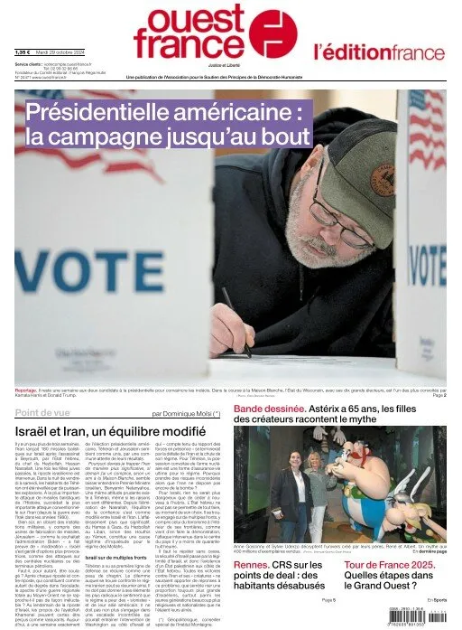 Ouest-France consacre également sa une à l'élection présidentielle américaine : le suspense durera jusqu'à la dernière minute. Les deux candidats sont au coude-à-coude. L'édito traite de la supériorité qu'Israël a pris sur l'Iran suite à ses bombardement ciblés contre le pays des mollahs. Le grand quotidien fête les 65 d'Asterix, le futur passage du Tour de France 2025 dans la région et fait un focus sur l'utilité relative des CRS sur les points de deal à Rennes après les évènements de samedi.