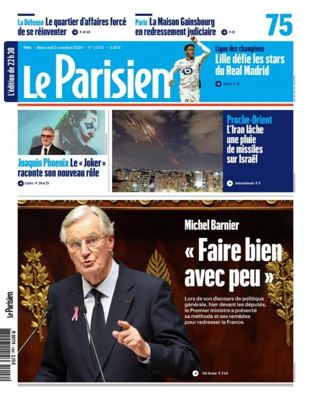 Le Parisien cite l'une des phrases de Michel Barnier lors de son discours de politique générale. Le Premier ministre a affirmé qu'il allait "faire bien avec peu". Notamment en taxant les entreprises et les plus riches. La "pluie de missiles" envoyés par l'Iran sur Israêl hier soir, qui n'aurait pas fait de victime grâce au fameux dôme de fer, fait l'autre gros titre. Fait intéressant pour l'économie de l'Ile-de-France, le quartier d'affaires de La Défense serait désormais dépassé, alors que l'on y construit encore des gratte-ciel.