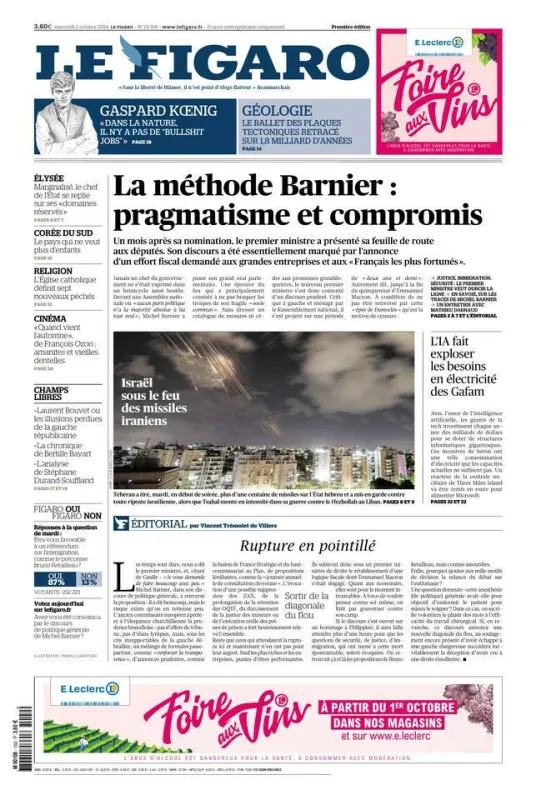 Fidèle à sa ligne éditoriale, Le Figaro revient sur le discours de politique générale et la feuille de route de Michel Barnier, dont la méthode est perçue comme pragmatique et ouverte au compromis, en insistant sur sa volonté de taxer les entreprises et les "Français les plus fortunés". L'édito du quotidien y est aussi consacré, évoquant "une rupture en pointillé' par rapport à la politique macroniste. La une comme d'habitude riche en information, nous apprend que l'intelligence artificielle fait exploser la consommation électrique des GAFAM, déjà pointés du doigt pour leur impact sur l'environnement.