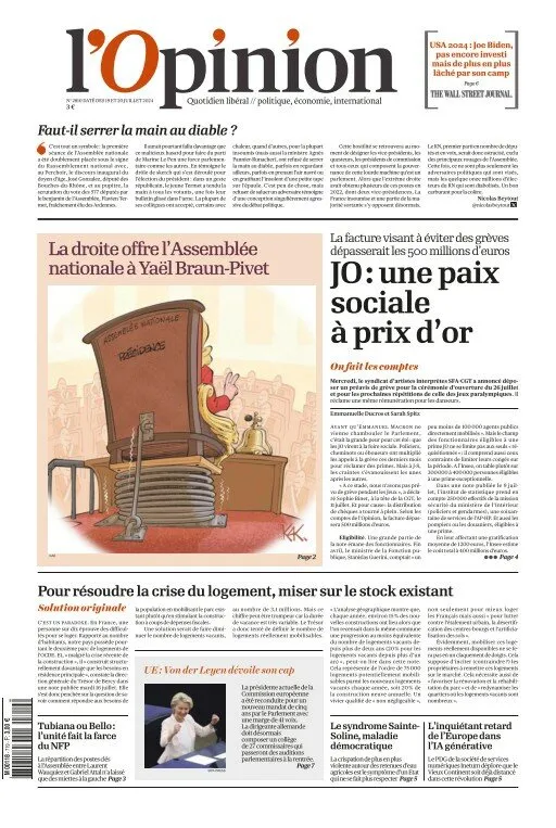 Présidente sortante de l'Assemblé nationale, la députée Renaissance Yaël Braun-Pivet a été réélue à son poste au troisième tour du vote au palais Bourbon, grâce aux voix des Républicains. Une surprise, le député communiste André Chassaigne, candidaté par le Nouveau Front populaire, étant favori. Mais la présence de LFI au sein du groupe commence à lui porter préjudice. Si la gauche dénonce des "magouilles", cette élection a au moins le mérite de dégager une tendance politique : et si Emmanuel Macron avait réussi son pari de dissoudre le Parlement en réussissant à avoir une majorité qui pèse ? En attendant le nouveau mandat d'Ursula von der Leyen à la tête de la commission européenne passerait presque inaperçu...
