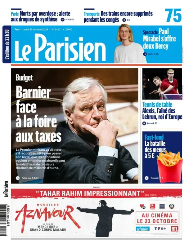 Le Parisien consacre lui aussi sa une à un Michel Barnier pensif, qui se demande si son projet de loi de finances 2025 va passer. Sauf que si certains opposants comme le Rassemblement national trouve qu'il contient trop de hausses d'impôts, la gauche veut elle y ajouter des dizaines de milliards de taxes en plus. Encore une fois entre censure et 49.3, le second risque d'être dégainé de multiples fois. Focus sur Alexis Lebrun, l'ainé cette fois-ci, sacré champion d'Europe de tennis de table.