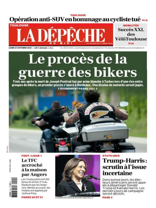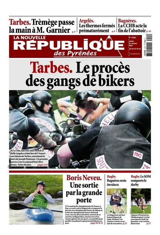 Ce sont les noms des deux gangs qui se sont affrontés il y a 3 ans à Tarbes, lors d'un salon. Le procès débutant ce lundi, La République des Pyrénées y consacre sa une et un dossier. L'actualité est consacrée au rugby local et à des actualités très régionales, comme à Tarbes où le maire Gérard Trémège "passe la main" à M. Garnier.