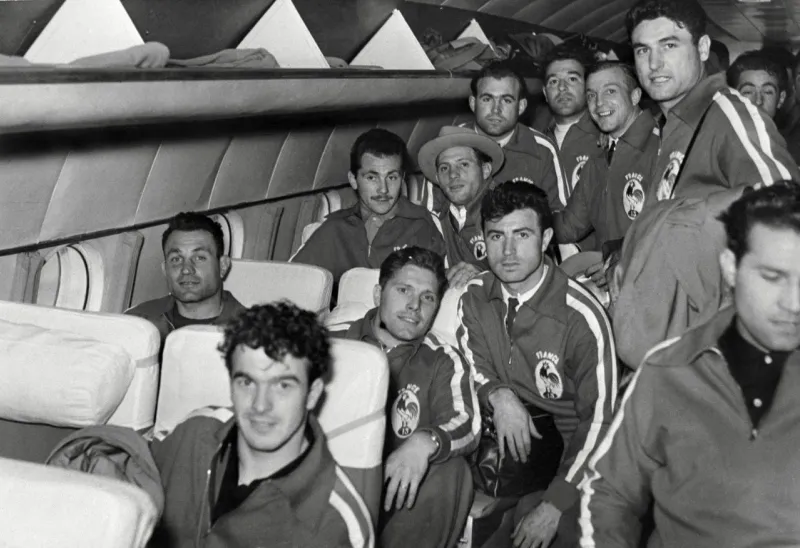 L'équipe française de rugby pose dans l'avion, lors de leur départ pour l'Australie, 15 mai 1951.