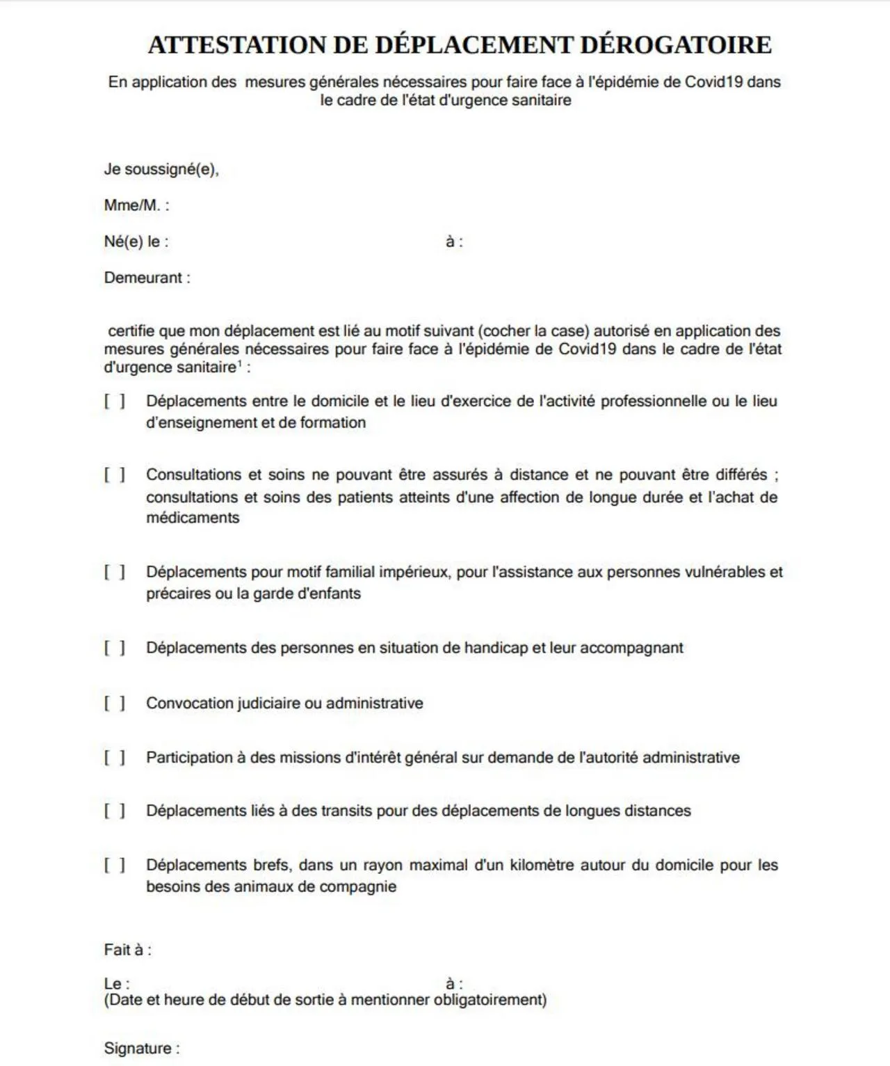 En revanche, le document n’est valable qu’une fois, pour une heure, et doit donc être renouvelé à chaque sortie. Il ne faudra donc pas oublier d’indiquer l’heure de sortie.