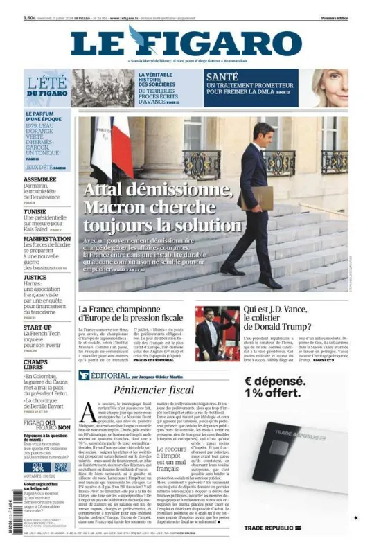 Le Figaro titre sur la démission de Gabriel Attal tout en indiquant qu'Emmanuel Macron reste en réflexion.