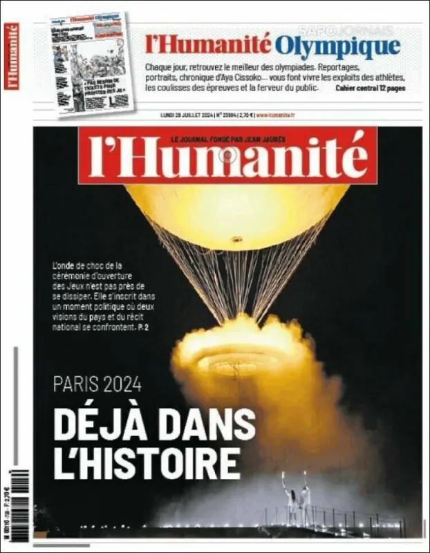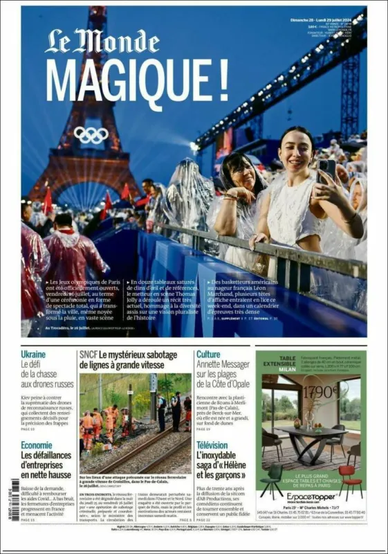 À la Une des quotidiens nationaux et régionaux ce lundi 29 juillet, ce sont bien sûr les Jeux Olympiques. Très attendue, la capitale était scrutée et le monde entier, impatient, de découvrir l’ouverture de la cérémonie qui s’est déroulée le vendredi 26 juillet. Un invité mystère a tout de même tenté de nous mettre des bâtons dans les roues, Madame la pluie. Malgré des conditions météorologiques peu favorables, la France a su briller à l'international.