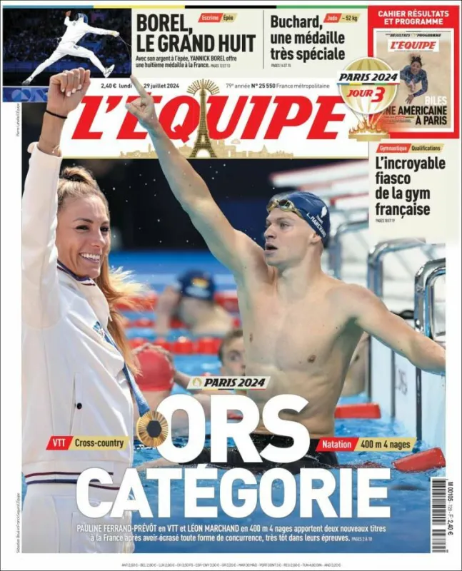 Le nageur Léon Marchand a été sacré champion olympique du 400m quatre nages ce dimanche tout comme Pauline Ferrand-Prévot qui a décroché l'or en VTT cross-country. L'épéiste Yannick Borel a remporté l'argent et Amandine Buchard le bronze au judo. La France compte huit médailles aux JO de Paris 2024.