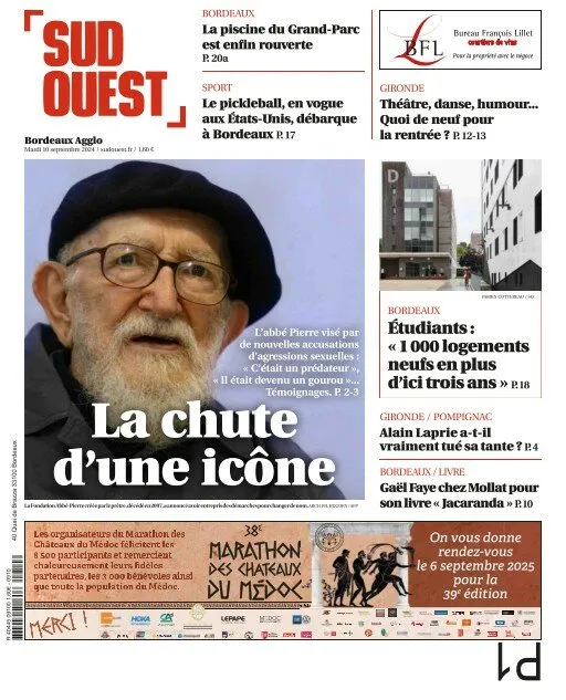 À la Une de ce mardi 10 septembre, l'image de l'abbé Pierre, l'une des figures préférées des Français, se dégrade à nouveau. De nouveaux témoignages l'accusent de violences sexuelles et de viols, révélant le portrait sombre d'un prédateur sexuel.