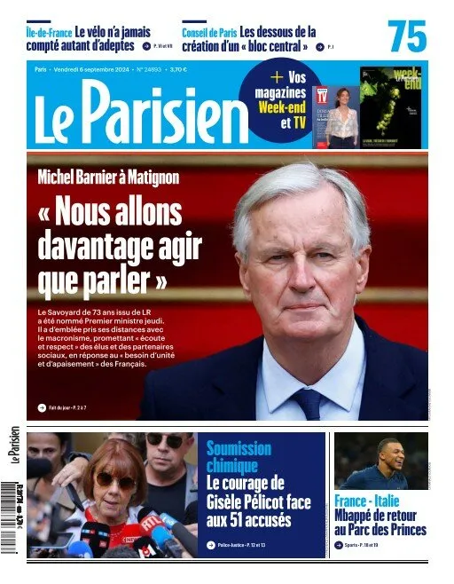 "Nous allons davantage agir que parler" titre Le Parisien, citant le discours de passation de pouvoir qui a eu lieu hier à Matignon avec Gabriel Attal. Une pique clairement lancée à son prédécesseur. Le quotidien laisse sa chance au nouveau Premier ministre soulignant qu'il a "immédiatement pris ses distances avec le macronisme". Une partie de la une est consacrée au procès des viols de Mazan, présenté comme celui de "la soumission chimique", et met en avant le courage de la victime, Gisèle Pélicot, qui a pris la parole à la barre hier. Focus également sur le match de l'équipe de France ce soir et le retour de Kylian Mbappé au Parc des Princes, qui s'annonce mouvementé.