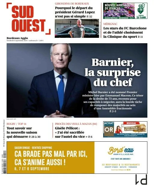 Pour Sud-Ouest, la nomination de Michel Barnier est "la surprise du chef". Le quotidien annonce que le nouveau Premier ministre aura la lourde tâche de composer une majorité à l'Assemblée. Sans juger de ses capacités. Il revient aussi sur la rétrogradation des Girondins de Bordeaux en National 3 et le possible départ de son président Gérard Lopez. Et cite aussi Geneviève Pélicot, qui au cours du procès des viols de Mazan a déclaré : "j'ai été sacrifiée sur l'autel du vice".