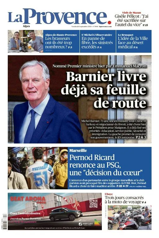 La Provence nous apprend que Michel Barnier, nouveau Premier ministre, a déjà une feuille de route. Il l'a en effet précisée hier lors de son allocution de passation de pouvoir mais celle-ci est peu ou prou la même que lorsqu'il s'était présenté aux primaires des Républicains en 2021, où il avait été battu par Eric Ciotti. Elle est bien de droite. Le quotidien régional revient aussi sur une affaire légère qui a secoué tout Marseille : le partenariat de Pernod-Ricard avec le Paris-Saint-Germain. La pression des supporters de l'OM aura fonctionné puisqu'il a été annulé. Le procès des viols de Mazan est aussi à suivre dans le journal.