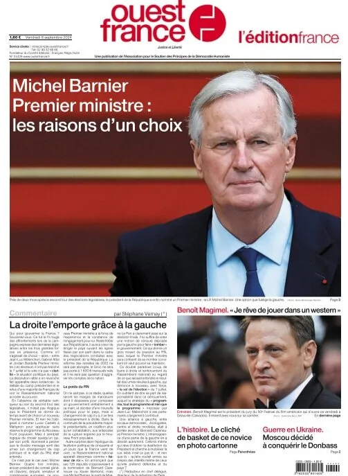 Ouest-France revient longuement sur les raisons qui ont poussé Emmanuel Macron a nommer Michel Barnier Premier ministre. Dans son édito, le quotidien estime lui que le responsable n'est pas le RN mais bien la gauche du Nouveau Front populaire et ses gesticulations, LFI en tête. À lire aussi, une interview de l'acteur césarisé Benoît Magimel qui "rêve de jouer dans un western.