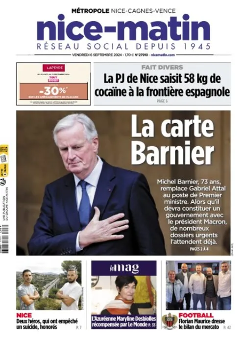Nice-Matin estime qu'Emmanuel Macron joue "la carte" Michel Barnier, et insiste sur les dossiers urgents qui s'accumulent déjà sur son bureau... Le quotidien ne porte pas de jugement et attend de voir la politique du Premier ministre. Et revient aussi sur le mercato de l'OGC Nice mené par l'ancien international français Florian Maurice. Enfin, une manchette félicite la très grosse saisie de 58 kg de cocaïne par la PJ à la frontière espagnole.
