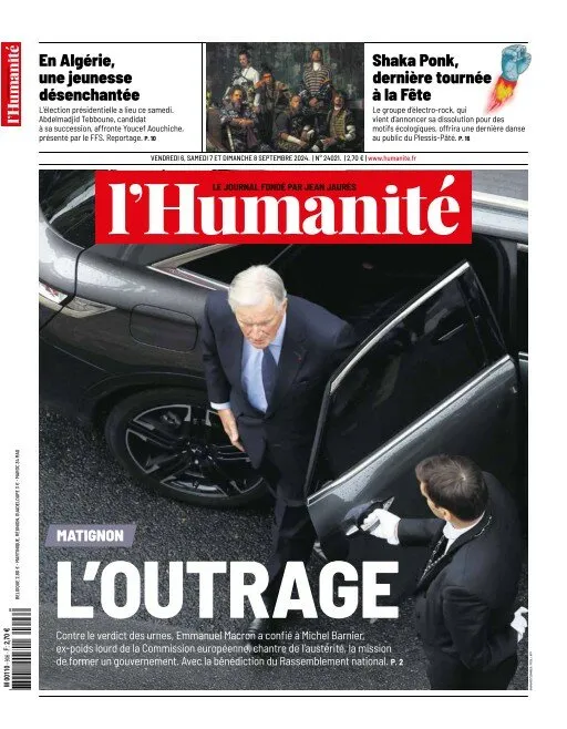 L'Humanité n'y va pas par quatre chemins et qualifie tout simplement la nomination de Michel Barnier "d'outrage". Le quotidien accuse aussi Emmanuel Macron d'avoir eu l'aval du Rassemblement national pour installer à Matignon celui qui est considéré comme un "ex-poids lourd de la Commission Européenne". Une partie de la une est consacrée aux élections présidentielles qui ont lieu samedi en Algérie et le journal s'inquiète de l'état d'une "jeunesse désenchantée".