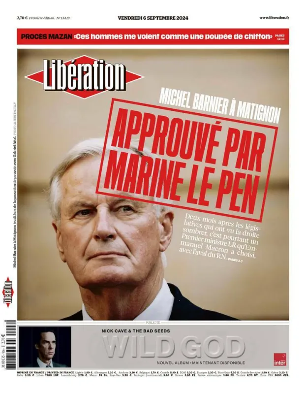Libération accuse en gros caractères Emmanuel Macron d'avoir pactisé avec le Rassemblement National pour choisir Michel Barnier comme Premier ministre. Pour le quotidien, la droite a perdu les élections législatives et n'aurait légitimement pas dû avoir accès à Matignon suite au vote des Français. Une manchette réduite revient sur le procès des viols Mazan : "ces hommes me voient comme une poupée de chiffon" s'indigne la victime.