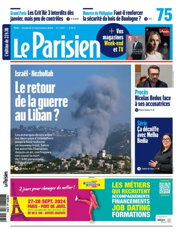 Le Parisien consacre la plus grande partie de sa une à la situation au Liban et s'inquiète d'un possible retour de la guerre dans ce pays malheureusement habitué aux conflits. Et rapporte que selon les autorités, les bombardements israéliens y ont fait 1 540 morts depuis un an. Après me meurtre de Philippine, la sécurité du bois de Boulogne est mise en question. Autre procès évoqué : celui de Nicolas Bedos, accusé d'agressions sexuelles.