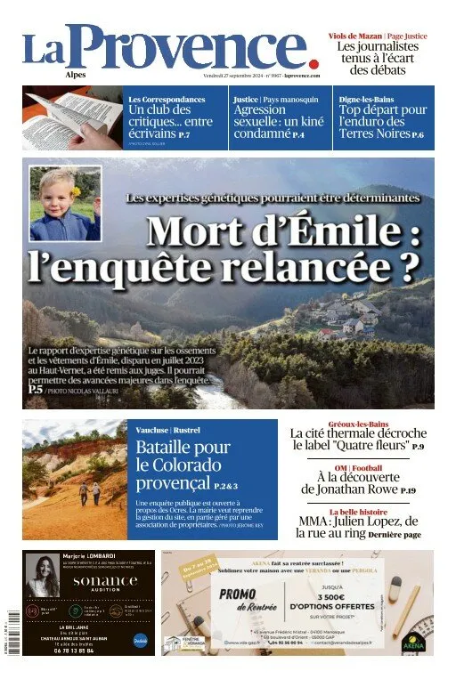 La Provence consacre sa une à de possibles révélations à venir suite à l'analyse de la dépouille du petit Emile. Concernant le procès de Mazan, comme toute la presse, le quotidien du sud déplore que les journalistes soient "tenus à l'écart" du procès, le président du tribunal ayant décrété le huis-clos pour la diffusion des vidéos des viols de Gisèle Pélicot. Focus sur le "Colorado provençal" à Rustrel, dont la municipalité veut reprendre la gestion.