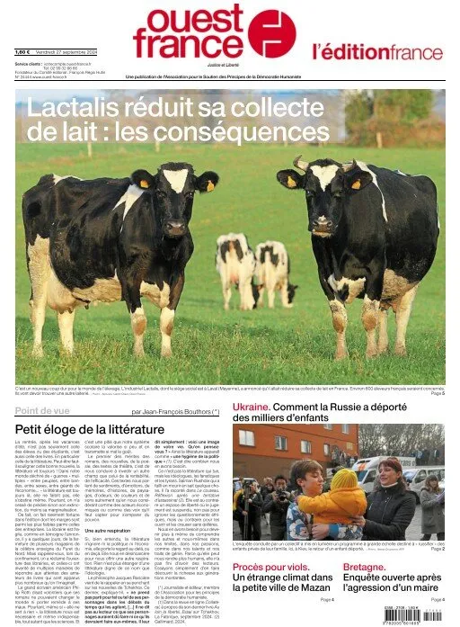 L'agriculture est à nouveau mise à mal en France. Le géant Lactalis a en effet décidé de se fournir désormais à hauteur de 10 % à l'étranger. Ouest-France fait le point sur les conséquences de cette stratégie qui met dans la tourmente les producteurs de lait français. Un article est consacré à l'atmosphère étrange qui régnerait dans la ville de Mazan depuis le début du procès, sur l'agression hier du maire de Saint-Brieuc, dont l'auteur a été place en hôpital psychiatrique et sur la Russie, qui déporte des milliers d'enfants ukrainiens pour les rééduquer.