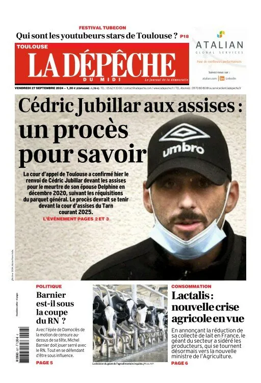 La Dépêche du Midi s'inquiète également des conséquences de la décision de Lactalis de réduire le lait d'origine France dans sa production et de la "crise agricole" qui porrait un an après repartir. Principale information de sa une : Cédric Jubillar sera jugé aux assises suite à une décision de la cour d'appel de Toulouse, son procès étant programmé "courant 2025". Le quotidien s'interroge aussi sur le niveau de pression que peut avoir le Rassemblement national sur le Premier ministre Michel Barnier.