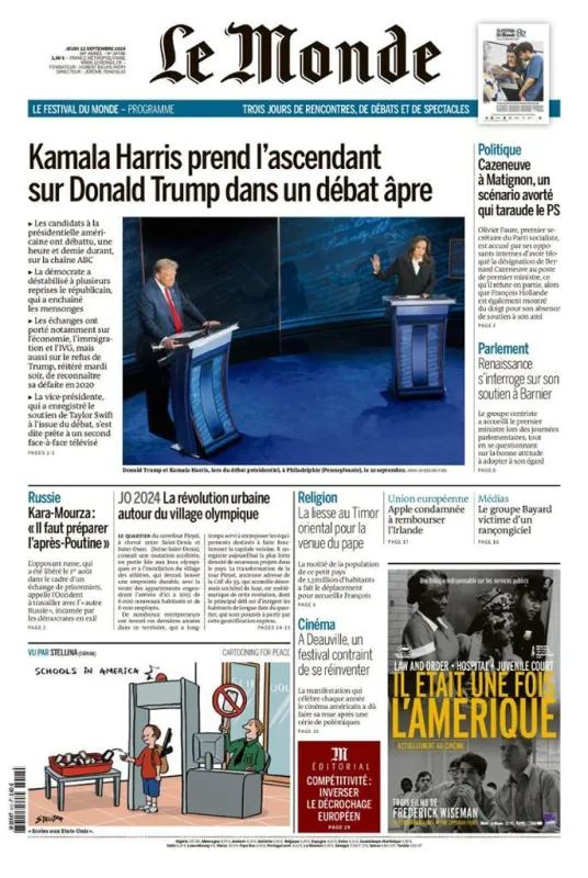 Le Monde fait sa une sur le débat "âpre" durant lequel Kamala Harris a largement dominé Donald Trump et qui "enregistre le soutien de Taylor Swift" et ainsi de ses dizaines de millions de "Swifites" rien qu'aux États-Unis. Le quotidien du soir revient sur le rendez-vous manqué de Bernard Cazeneuve avec Matignon, la très lourde somme qu'Apple doit rembourser à l'Irlande ou l'effet positif sur l'urbanisme qu'a eu le Village Olympique sur la ville de Saint-Denis (93).