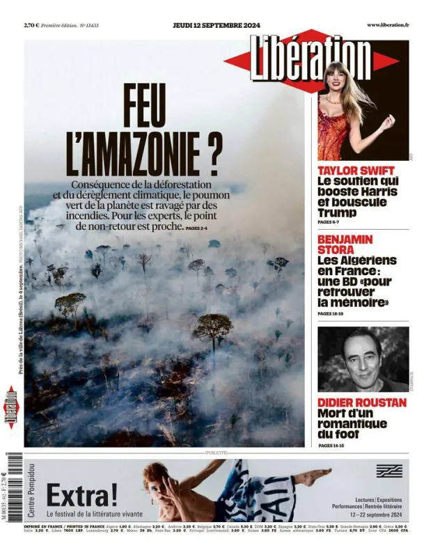 Les terribles feux qui sont en train de ravager la forêt amazonienne dus à la déforestation sont une catastrophe pour la planète et Libération cite des experts pour qui "le point de non-retour" a été atteint. Le quotidien revient sur la possibilité de voir Taylor Swift "booster" la campagne de Kamala Haris allant jusqu'à déstabiliser Donald Trump. Un hommage est rendu à Didier Roustan, décédé hier à seulement 66 ans après une lutte de plusieurs semaines contre la maladie.
