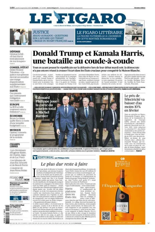Pour Le Figaro, si Kamala Harris a bien remporté le débat avec Donald Trump, son édito affirme que "Le plus dur reste à faire". Effectivement, les sondages sont toujours très serrés pour l'élection présidentielle américaine et les deux candidats sont au "coude-à-coude". Bonne nouvelle, le prix de l'électricité va chuter de 10 % en février et soulager le porte-monnaie de millions de Français. Retour sur l'affaire des rugbymen Jégou et Auradou toujours soupçonnés de viol en Argentine bien que de retour sur le sol national.