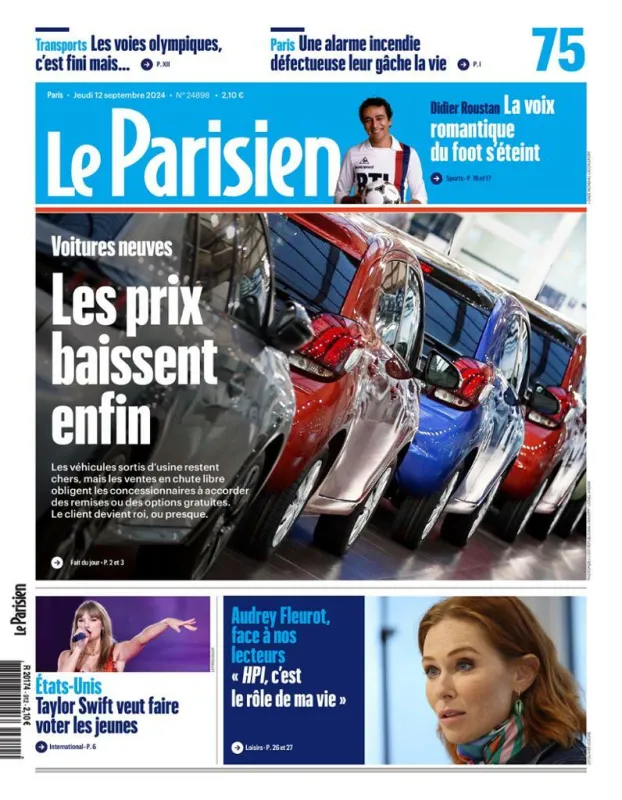 Pour Le Parisien, l'information du jour est la baisse des prix sur les véhicules neufs après plusieurs années de hausses consécutives, qui passe par des remises ou des options offertes. Hommage est là aussi rendu à Didier Roustan, "la voix romantique du foot". Le quotidien régional consacre aussi un article à la chanteuses américaine Taylor Swift qui a pris position pour Kamala Harris et appelle les jeunes à voter.