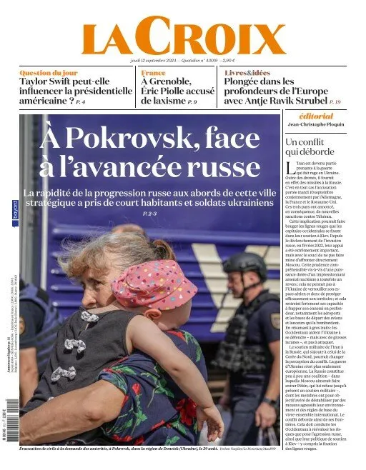 La Croix consacre sa une au reportage réalisé en Ukraine, où la population de Pokrvosk fuit l'avancée de l'armée russe, mais aussi son édito pointant un conflit qui pourrait s'étendre. Focus aussi sur l'influence de Taylor Swift sur l'élection américaine et s'interroge sur la situation d'insécurité que subit Grenoble, posant la question à propos du maire : "Eric Piolle est-il laxiste".