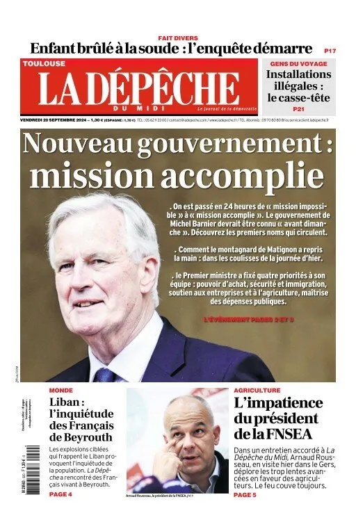 Pour La Dépêche du Midi, le Premier ministre Michel Barnier a réussi la mission qui lui était confiée : présenter une liste qui convienne à Emmanuel Macron pour constituer le futur gouvernement. Autres gros titres : l'inquiétude des Français résidant à Beyrouth après les représailles contre le Hezbollah qui risquent d'embraser le pays, et l'interview du président de la FNSEA Arnaud Rousseau, qui alerte sur le ras-le-bol des agriculteurs qui se sentent laissés pour compte et pourraient retourner bloquer les routes.