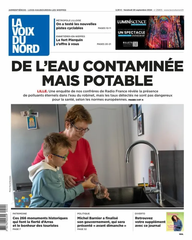 La Voix du Nord confirme ce que nous vous annoncions hier : une étude révèle que l'eau du robinet, potable, est toutefois contaminée dans une grande partie du pays par ce qu'on appelle les "polluants éternels," les PFAS. Leur taux ne serait pas suffisant pour que le sujet en devienne un de santé publique mais a de quoi inquiéter. Le quotidien revient lui aussi sur le gouvernement Barnier qui sera présenté "avant dimanche", et sur le patrimoine local à travers la ville d'Arras et ses 266 monuments historiques.