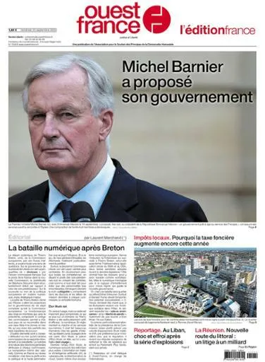 C'est en tout cas ce que suggère la une d'Ouest-France, le Premier ministre ayant même, disent les rumeurs, failli jeter l'éponge hier. Il a cependant réussi "à présenter son gouvernement". Le quotidien revient dans son édito sur la démission de Thierry Breton farouche combattant des GAFAM au niveau de la fiscalité et de la modération des contenus. La situation au Liban est évoquée, comme la nouvelle augmentation de la taxe foncière.