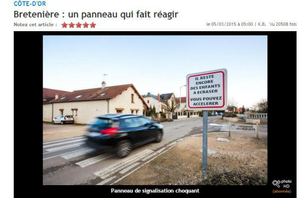 Le site Bienpublic.com a révélé jeudi une campagne de sensibilisation contre la violence routière pour le moins surprenante. A contre-courant de celles qu’on peut voir ou entendre habituellement, l'affichage mis en place par la ville à Bretenière, en Côte-d’Or, parie sur la provocation.