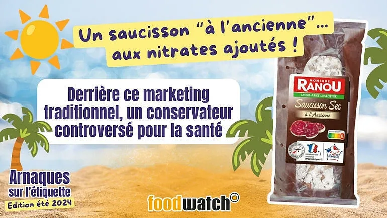 Annoncé comme fabriqué à l'ancienne, ce saucisson "contient en réalité du nitrate de potassium, le E252, un conservateur controversé pour la santé" d'après Foodwatch.