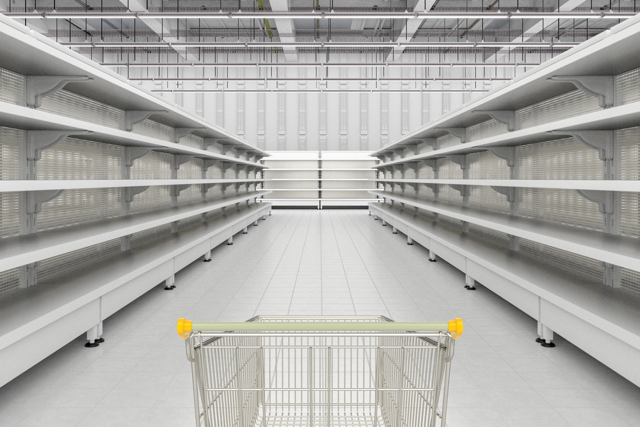 store interior with empty shopping cart in aisle of supermarket shelves 3d render