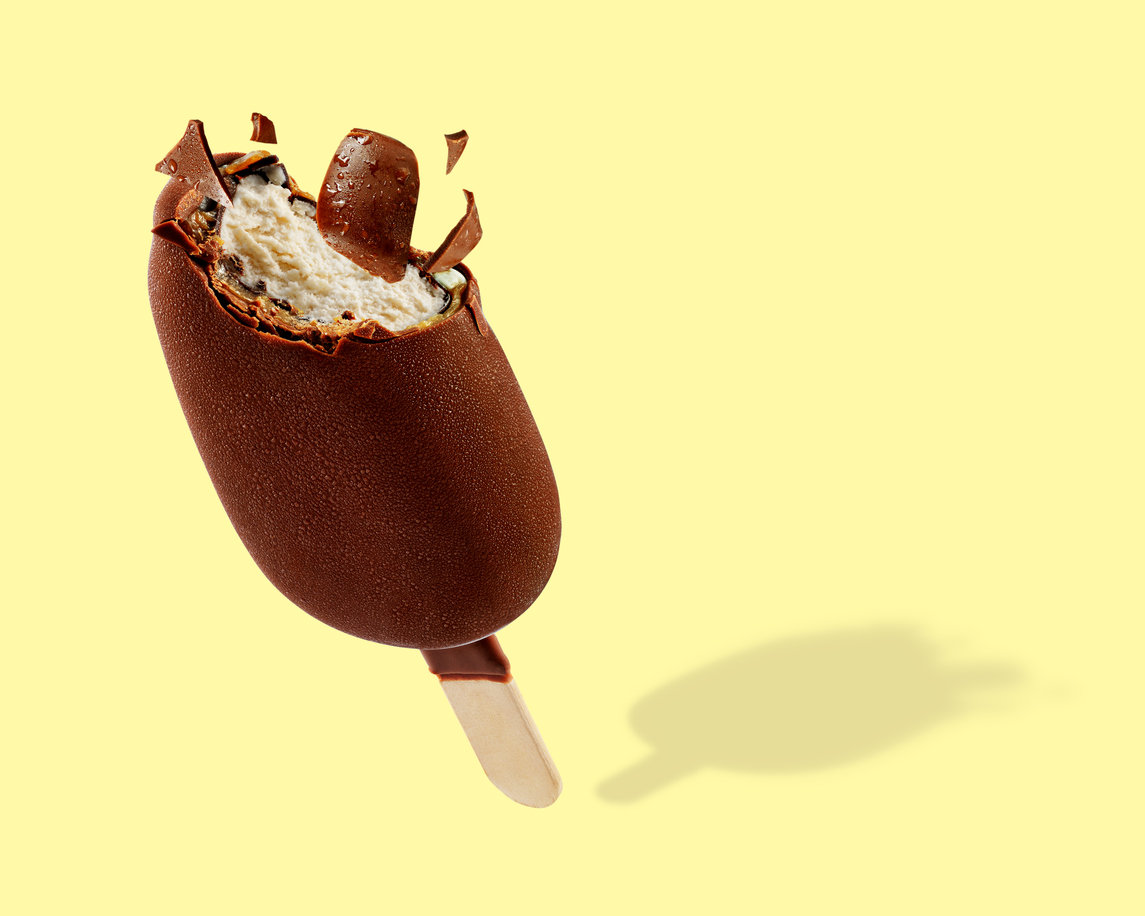 bitten vanilla ice cream popsicle with chocolatey coating on yellow background