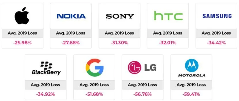Si Apple permet de perdre moins d'argent avec ses iPhones, les dévaluations des Nokia, Sony et HTC restent très proches de la marque à la pomme.
