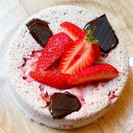 Ajouter quelques fraises préalablement coupées en morceaux. Disposer les carrés de chocolat sur ou dans la pâte pour obtenir un cœur fondant au chocolat.