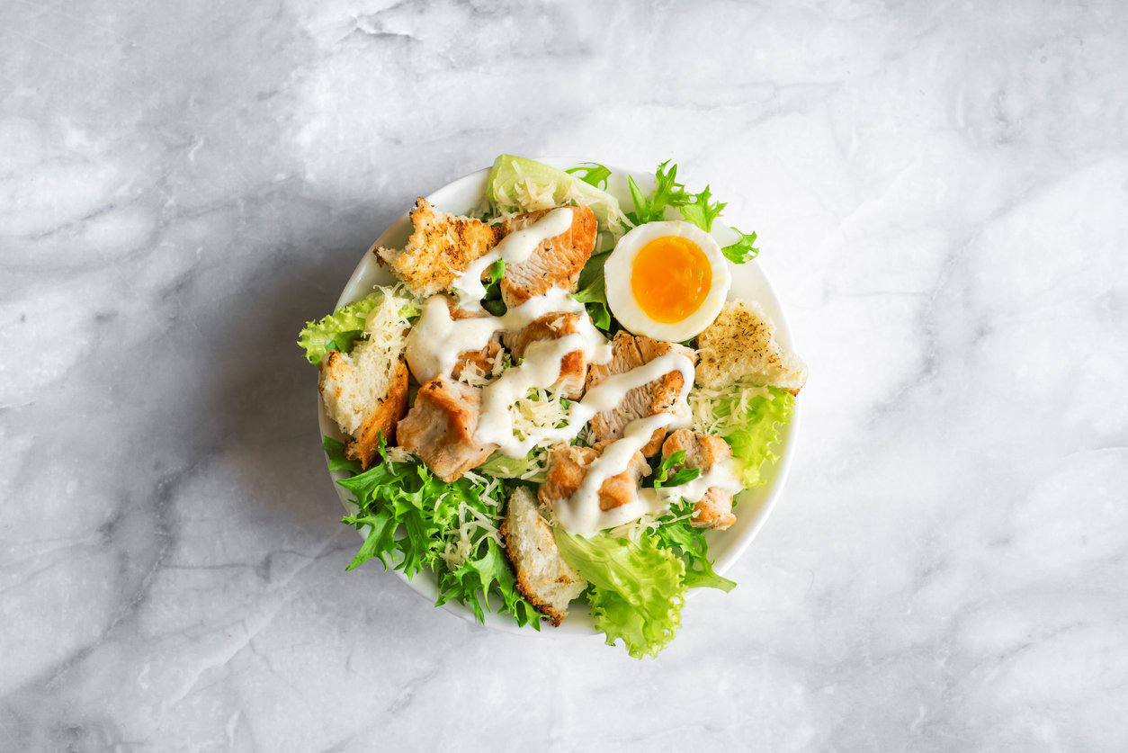 caesar salad on marble table, top view, copy space homemade chicken caesar salad with grilled croutons