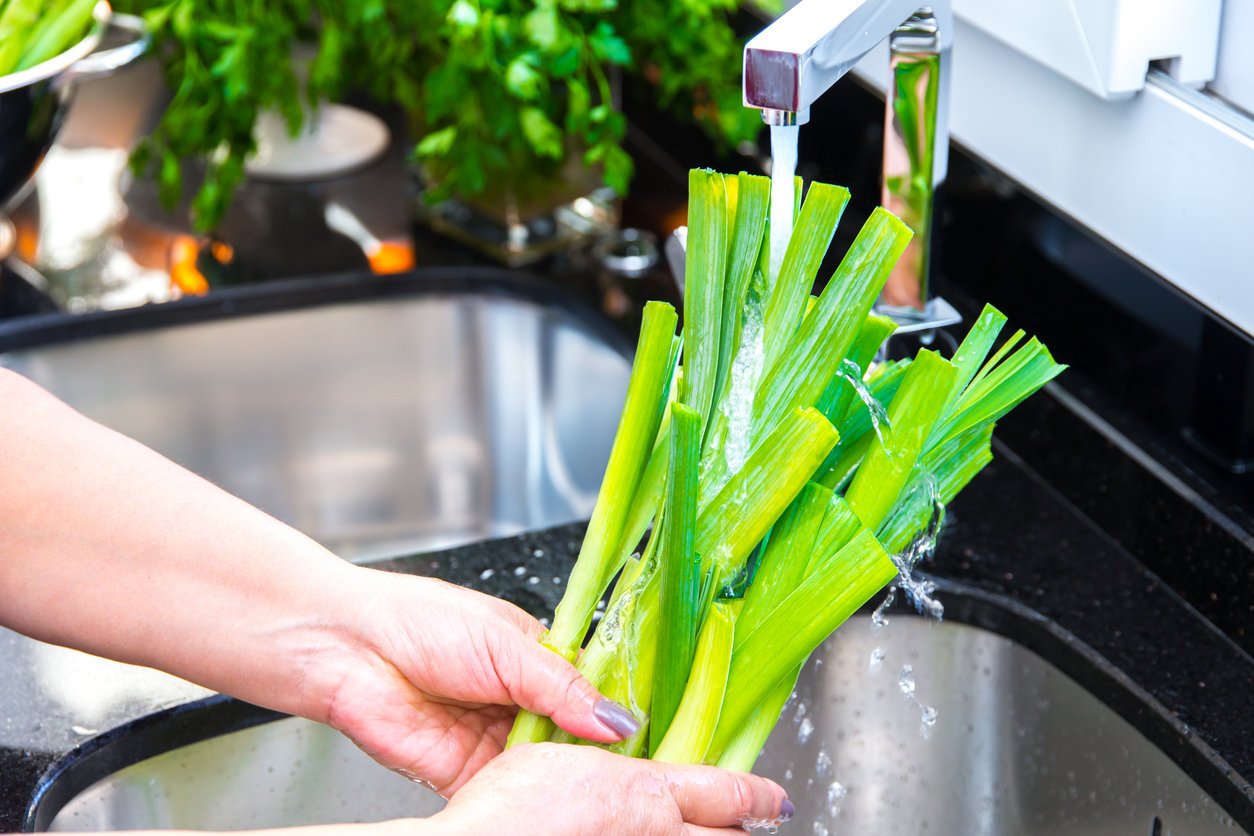 leek under running water