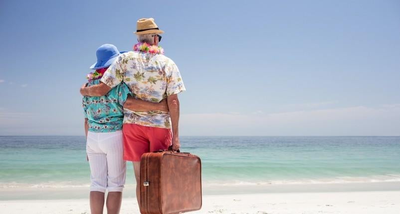 rear view of senior couple wearing a garland and holding suitcase on the beach