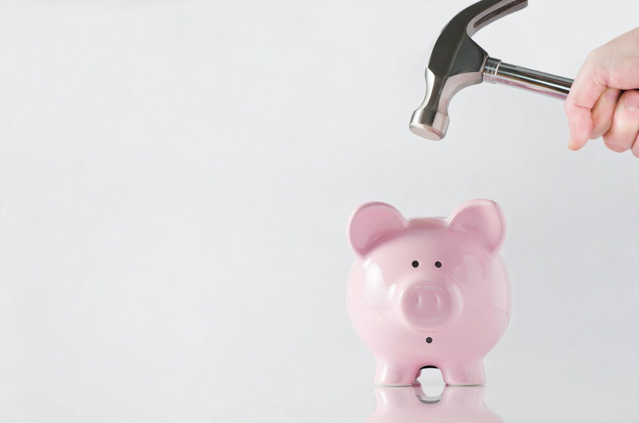 a hand holding a hammer which is raised above a pink china piggy bank, with a shocked and apprehensive facial expression reflective surface and light grey background copy space to the left