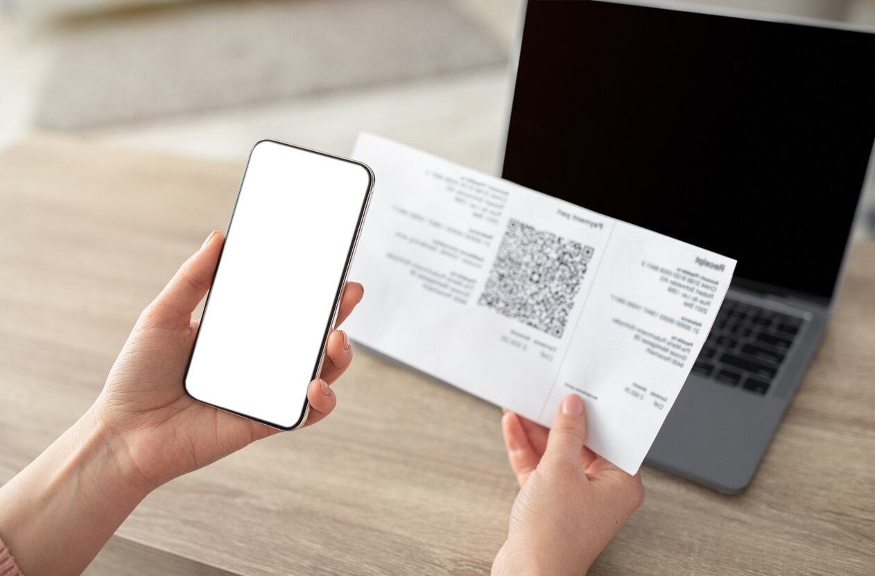 female hands holding smartphone and scanning the qr code from paper bill, cellphone with white blank screen paying online from home, modern technologies concept