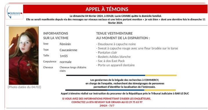 Mardi 4 février 2024, 5h20. Lucie Cavare, 16 ans, quitte son domicile situé à Vavincourt (Meuse). À leur réveil, les parents de l'adolescente remarquent qu'elle n'est plus dans sa chambre. Avant de se volatiliser, Lucie envoie un message à plusieurs de ses proches via les réseaux sociaux. Dans les poches, elle n'a ni papiers d'identité, ni argent, ni son téléphone portable. Elle a, en revanche, pris avec elle le téléphone de son petit frère. Ce dernier a arrêté de borner quelques heures après la disparition, vers dix heures du matin.