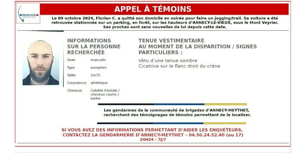 Le 9 octobre, c'est Florian C., dont l'âge n'a pas été communiqué, qui ne réapparaît pas après une sortie en soirée au Mont Veyrier pour un jogging ou un trail. Sa voiture a été retrouvée sur un parking en forêt sur les hauteurs d'Annecy-le-Vieux. Des recherches ont été menées dans des conditions difficiles par des gendarmes, des pompiers, et des bénévoles du secours en montagne sur deux jours, sans succès.